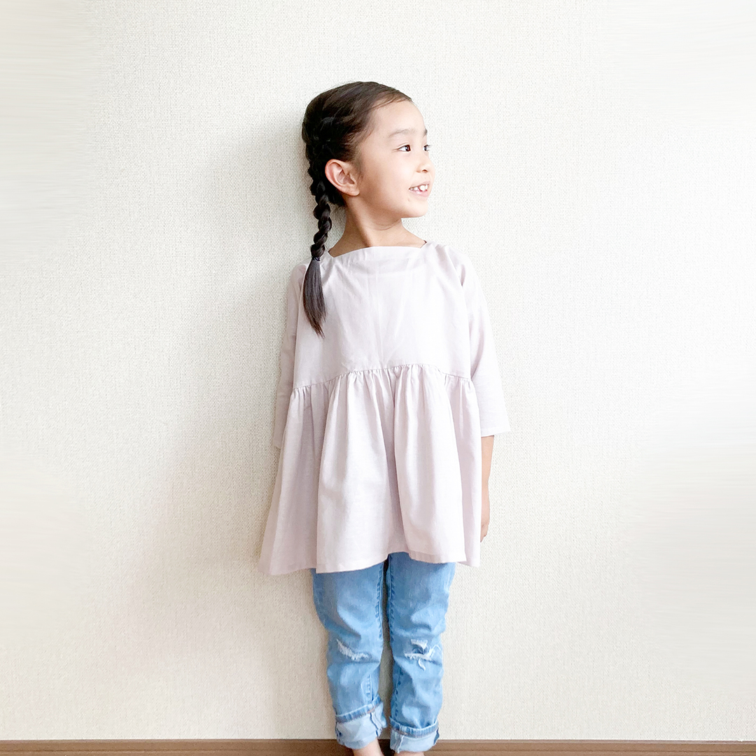 グレイッシュピンク:『CHECK&STRIPEの子ども服 ソーイング・ナーサリー』(文化出版局) スクエアネックのギャザーブラウス
