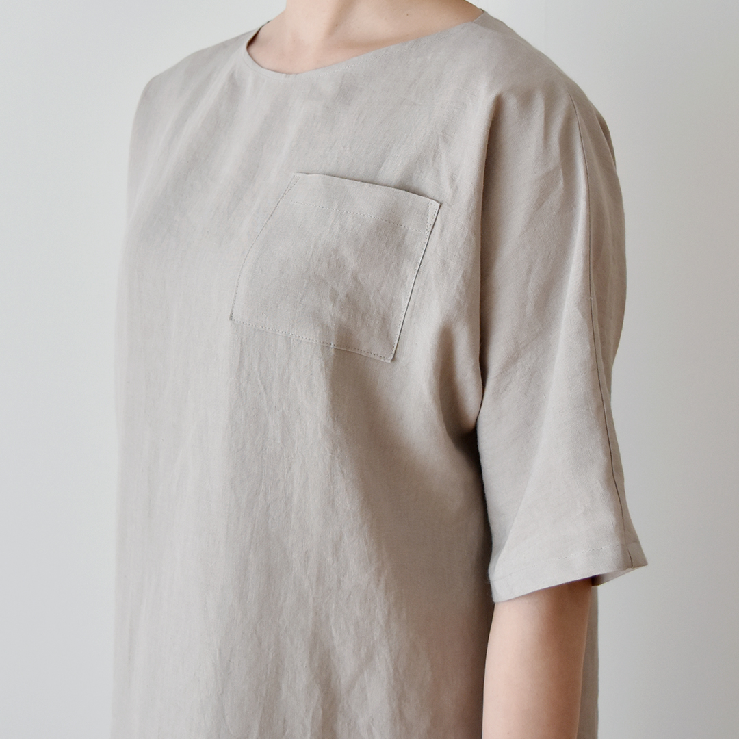 こちらの布をお買い上げのお客さまに、ラインでつなぐワンピース(スリット入りロング丈) のレシピをお付けいたします。(サンプル:グレージュ) ※用尺110cm幅×2.4m