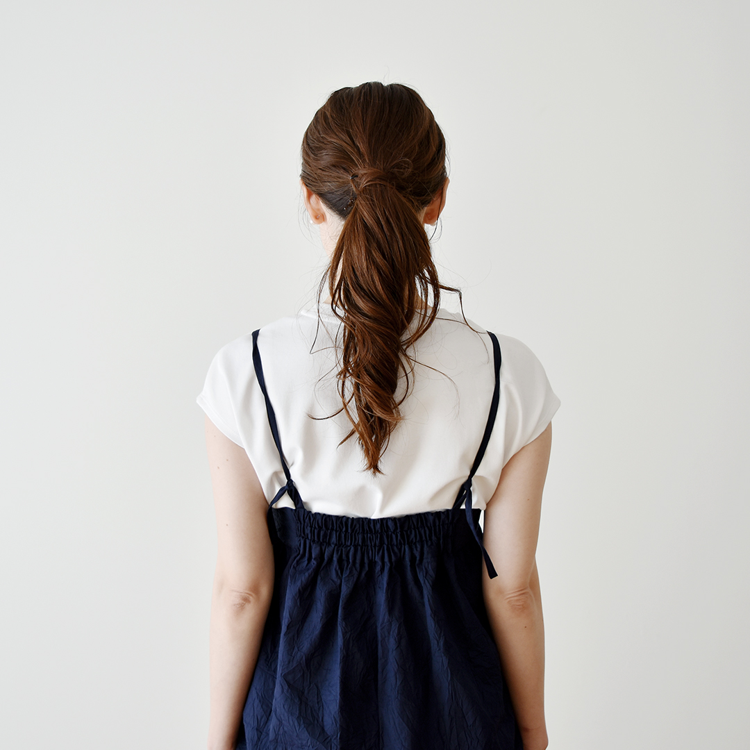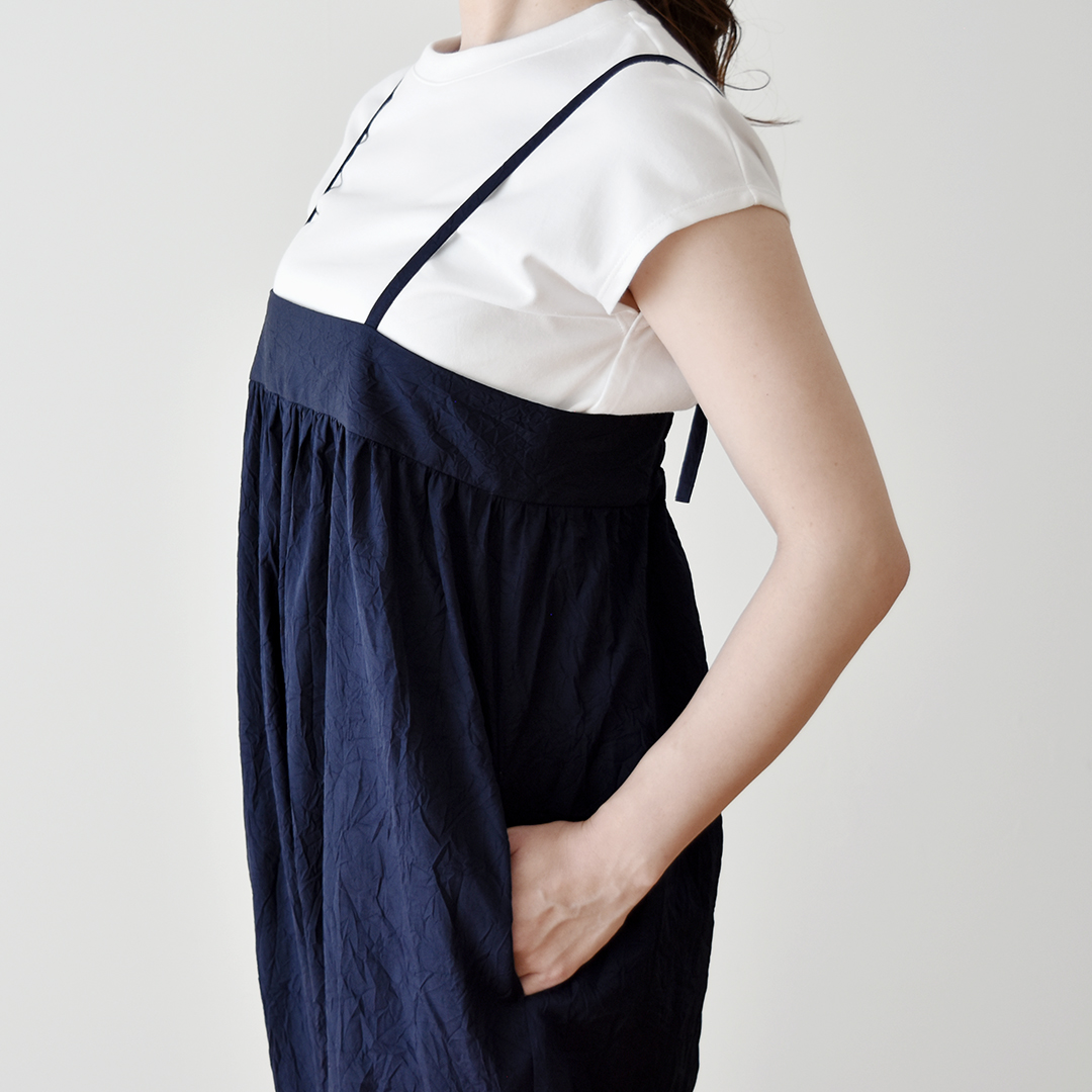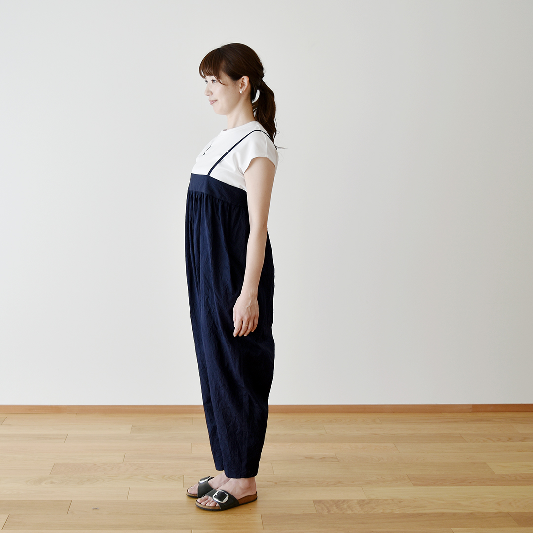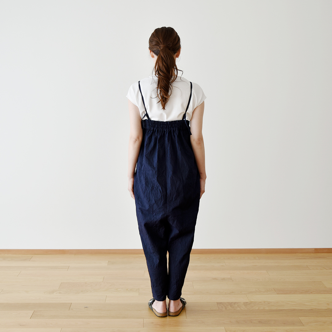 スタンダードネイビー:『CHECK&STRIPE COLOUR BOOK 色を楽しむソーイングブック』(文化出版局) 後ろゴムのギャザーサロペット