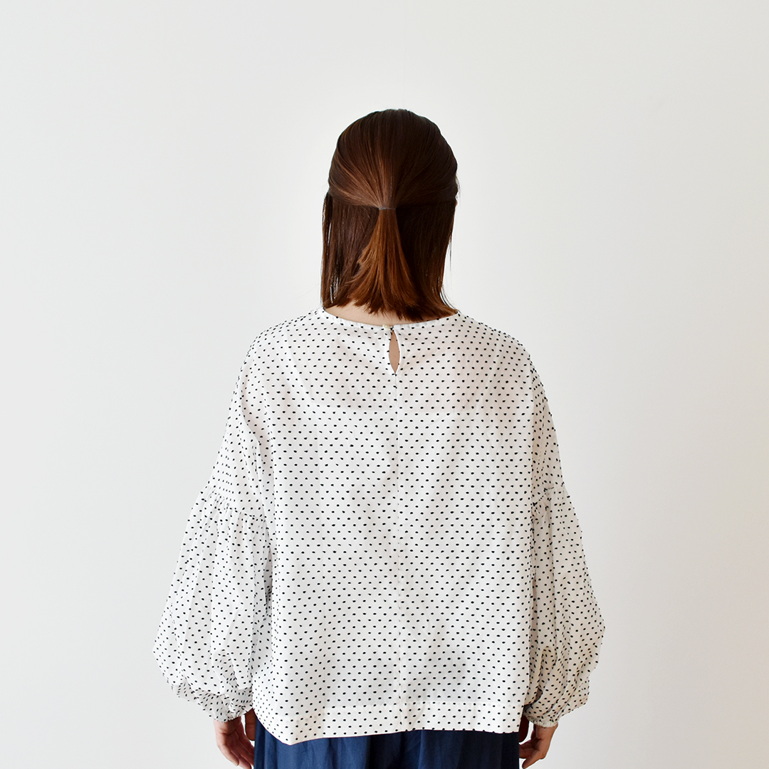 透け感のある布にカットドビーで表現された水玉がかわいい布です。
