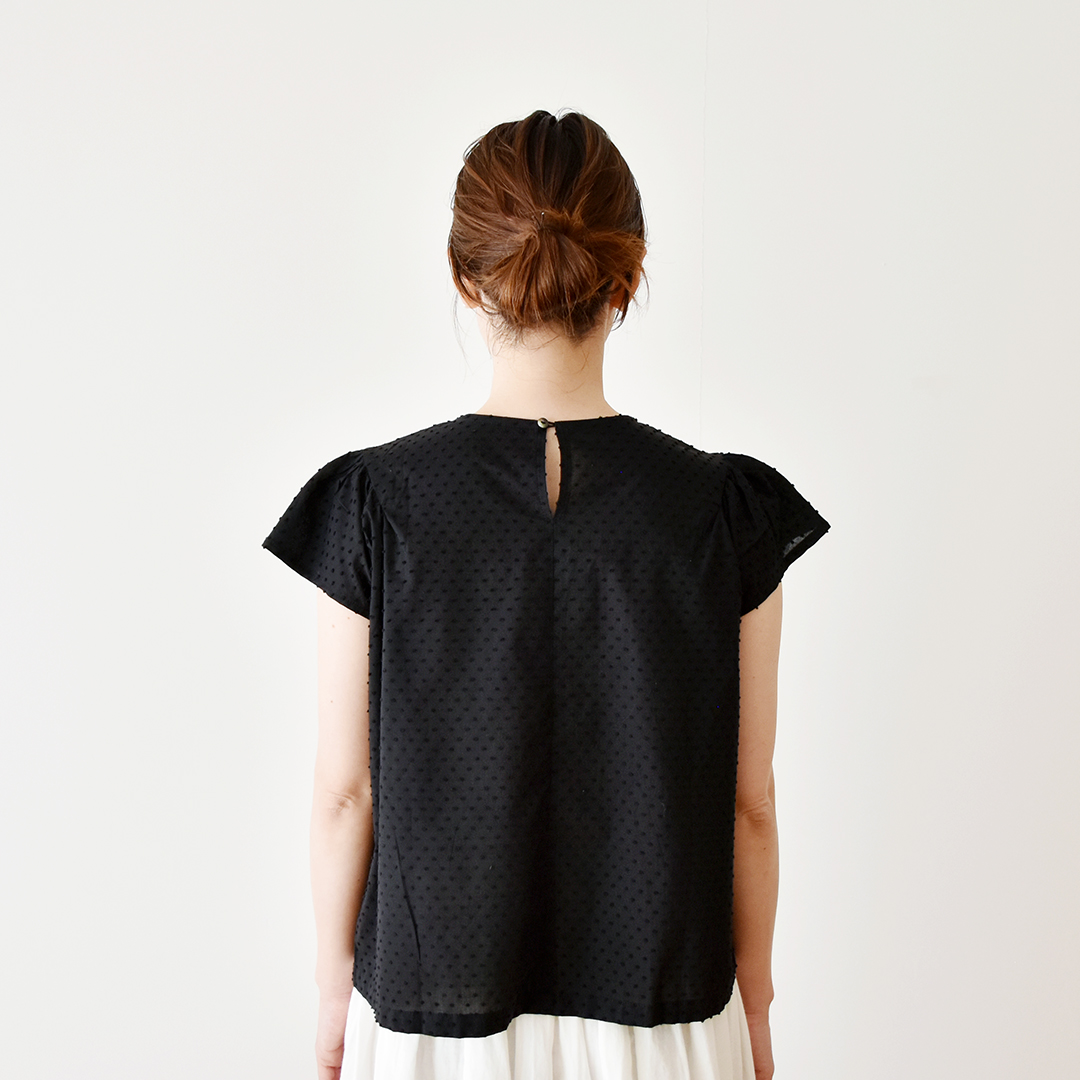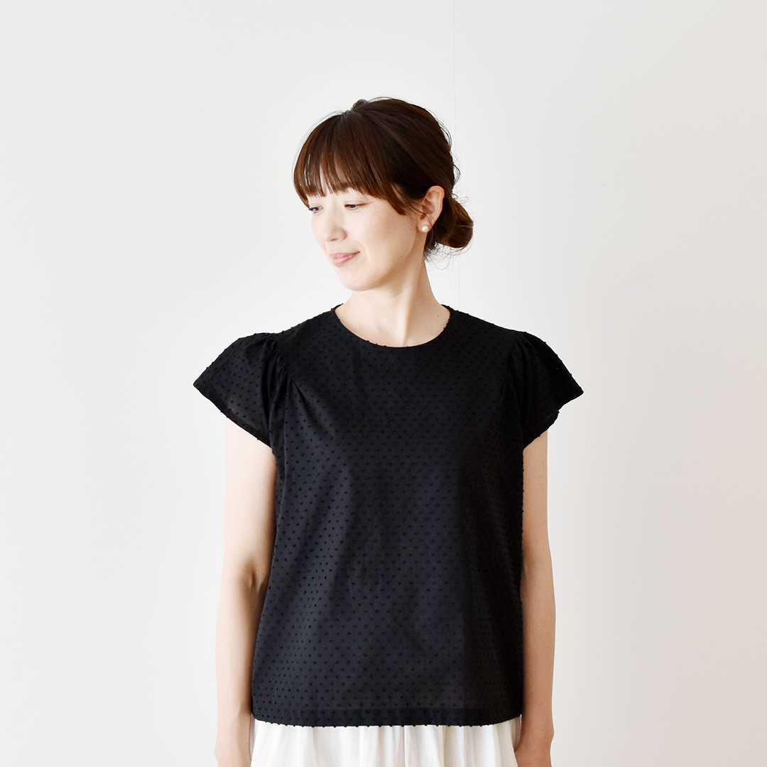 こちらの布をお買い上げのお客さまに、ショルダーギャザーのフレンチスリーブブラウスのレシピをおつけいたします。(サンプル:黒に黒) ※用尺:105cm幅×1.6m
