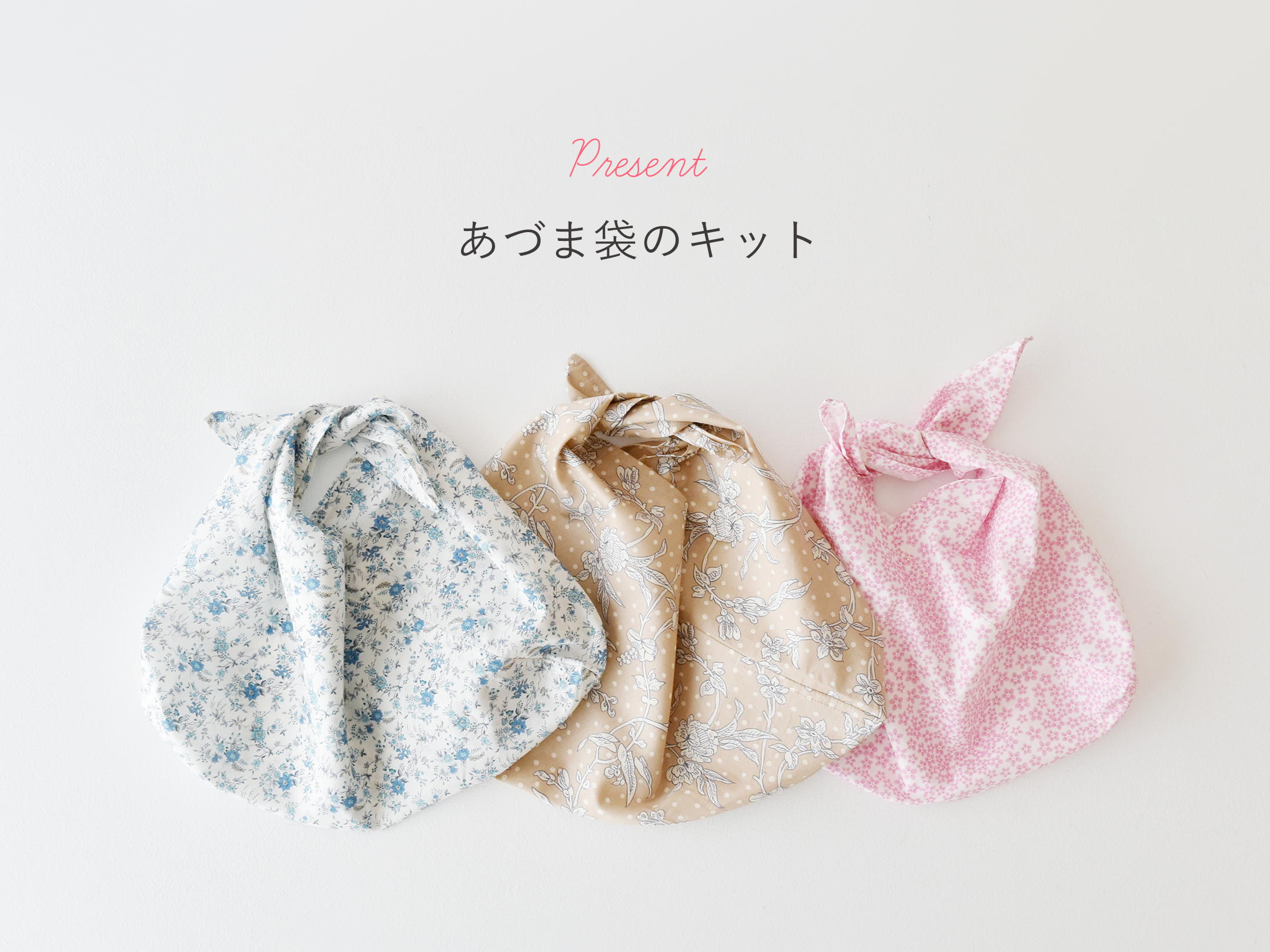 今回の「4月リバティプリント限定柄予約販売」の商品を税抜7,000円以上(税込7,700円)ご注文いただき、宅急便をお選びの方にリバティプリントでつくる「あづま袋のキット」をプレゼントいたします。